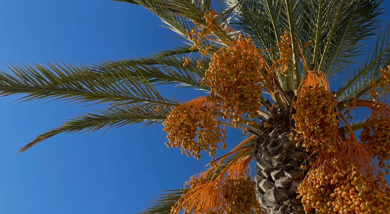 Le palmier-dattier possède des racines profondes qui lui permettent de puiser l’eau dans les nappes phréatiques, ce qui assure sa résistance aux conditions désertiques. Ses frondes limitent l’évaporation et protègent les fruits de la chaleur excessive. Ces adaptations rendent la Medjool durable dans les zones arides et intégrable dans des écosystèmes fragiles.