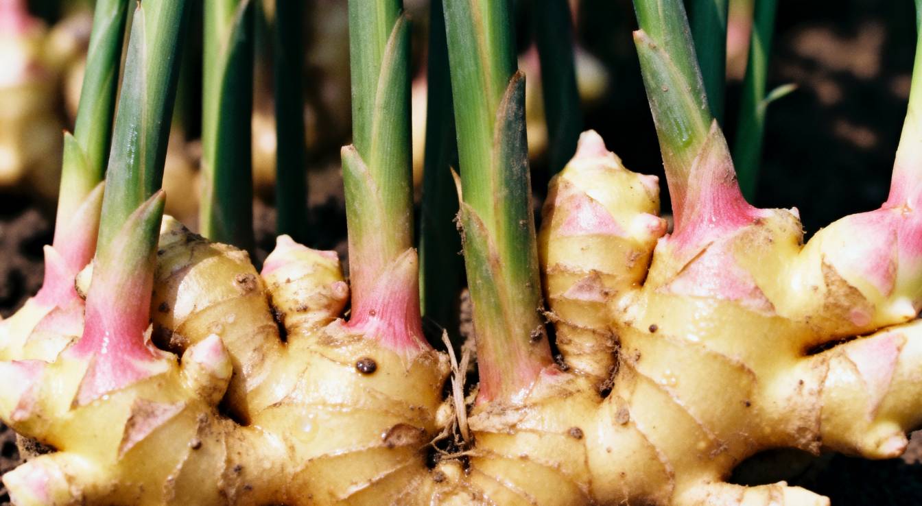 Le rhizome est l’organe central du Gingembre officinal, à la fois structurel et fonctionnel. Il mesure souvent 5 à 10 cm de long pour 2 à 4 cm de diamètre, présentant des ramifications selon l’âge de la plante. Sa surface est brunâtre à l’extérieur et jaunâtre à l’intérieur, avec une texture fibreuse et une odeur caractéristique. Le système racinaire, peu profond, s’étend horizontalement et assure l’ancrage et l’absorption des nutriments essentiels.