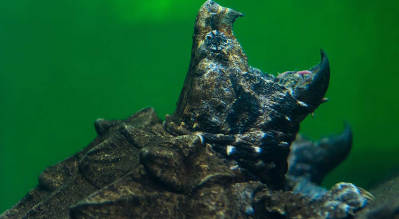 La carapace de la tortue alligator est extrêmement robuste, composée de plaques osseuses fusionnées, ce qui lui confère un aspect presque préhistorique. Sa surface est fortement crénelée, rappelant la peau d’un alligator, d’où son nom. La coloration va du brun foncé au noir verdâtre, avec des motifs variables selon les individus et les régions. Sa peau est épaisse et rugueuse, offrant une protection supplémentaire, notamment au niveau du cou et des membres, qui sont munis de griffes puissantes.